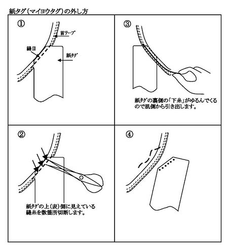 下着に説明が印刷された紙のタグが糸で縫い込まれてい